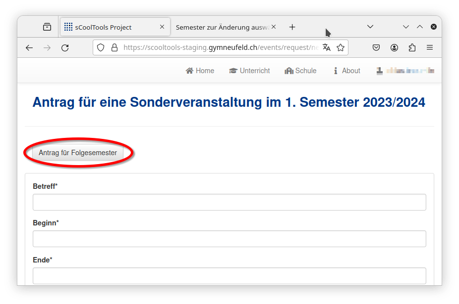 Sonderveranstaltungen können in sCoolTools grundsätzlich für das laufende Semester beantragt werden. Sobald der Stundenplan für das Folgesemester definitiv in sCoolTools importiert worden ist, können über den Button Antrag für das Folgesemester